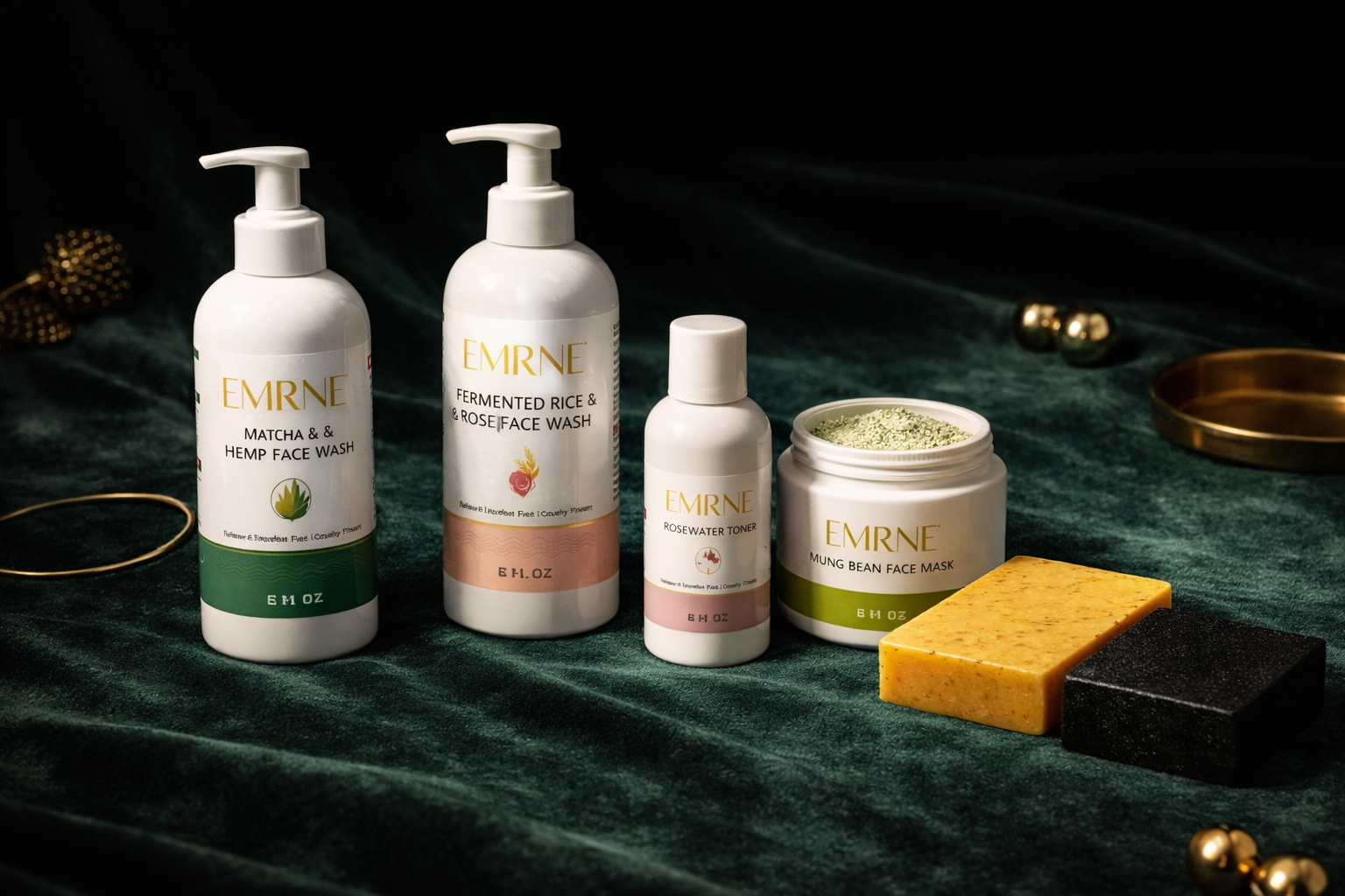 All six formulations. The complete EMRNE ritual — two face washes, a toner, a mask, and two soap bars — curated to work together from morning to night.